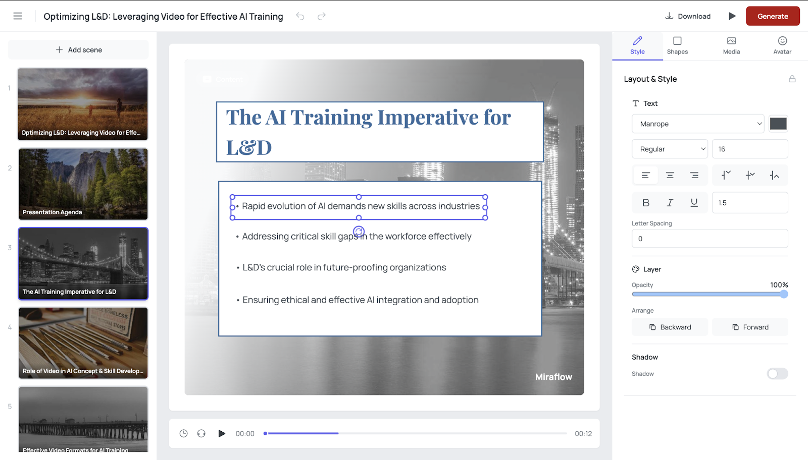 AI video generation platforms for learning and development convert your scripts into professional training videos. Upload your text, select an AI avatar to present the material, and choose a voice that matches your company culture.