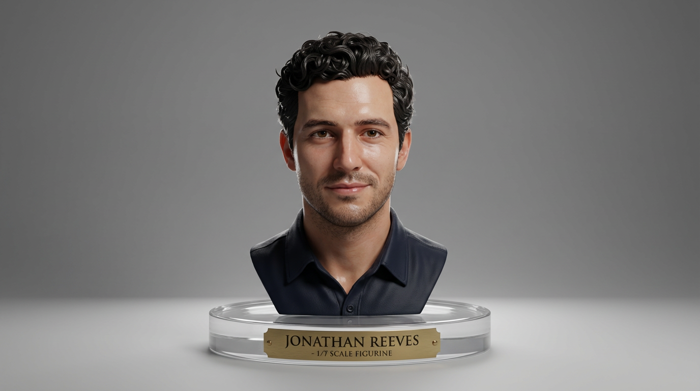 Create a hyper-realistic 1/7 scale collectible figurine of the subject from the uploaded photo.Glossy vinyl texture with detailed sculpting and clean edges.Soft studio lighting with balanced shadows.Place the figure on a clear acrylic base with an engraved nameplate.Product display lighting, photorealistic finish.